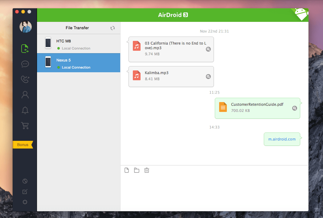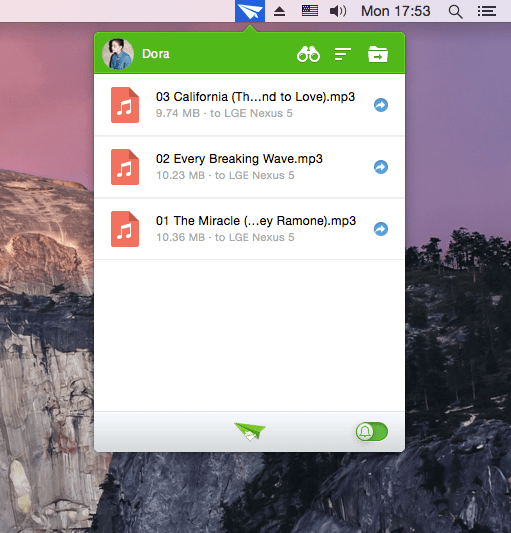Этой функции позавидует каждый владелец iPhone. Перетащите любой файл на иконку приложения в статус баре, и он сразу же появится на вашем смартфоне. Эта функция будет работать как при локальном, так и при удалённом соединении. Но стоит учесть, что файлы, которыми вы обмениваетесь, будут храниться на серверах AirDroid лишь в течение семи дней.